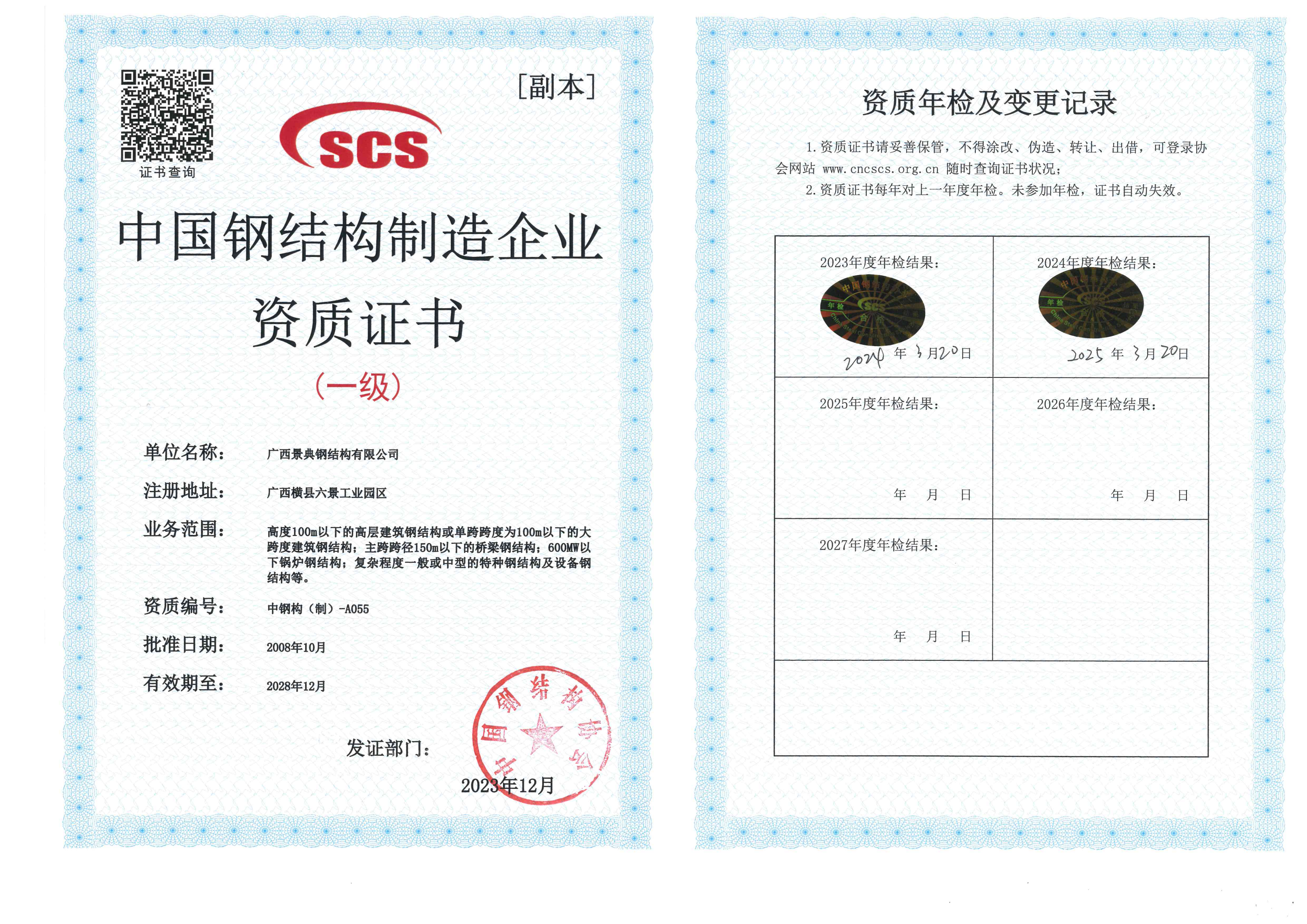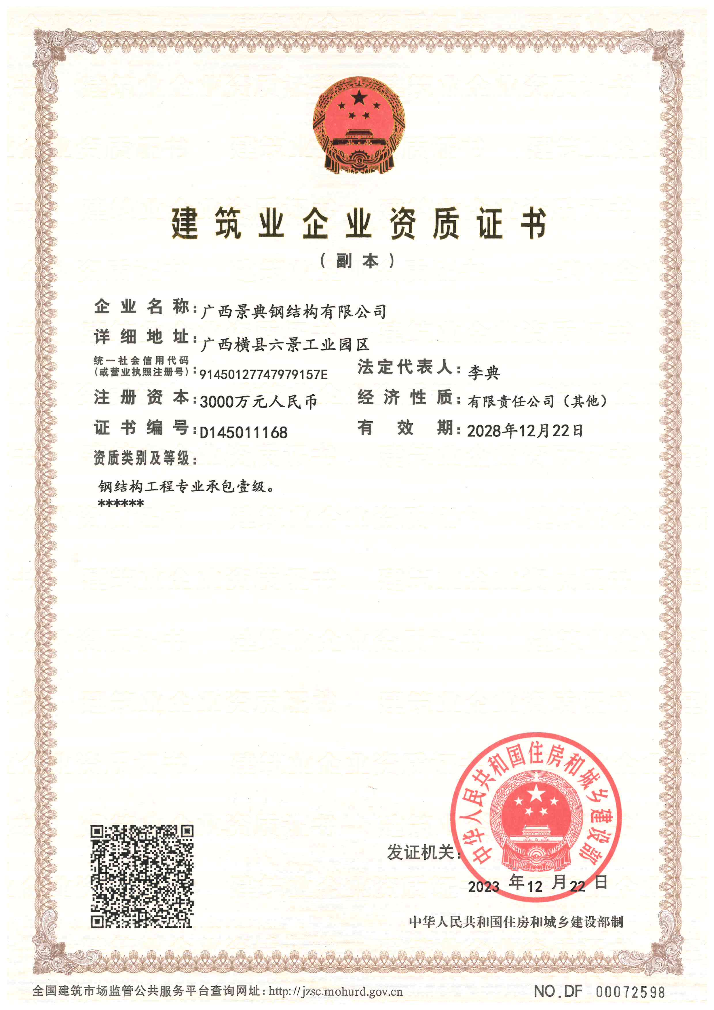 中国钢结构制造企业资质证书(一级)
