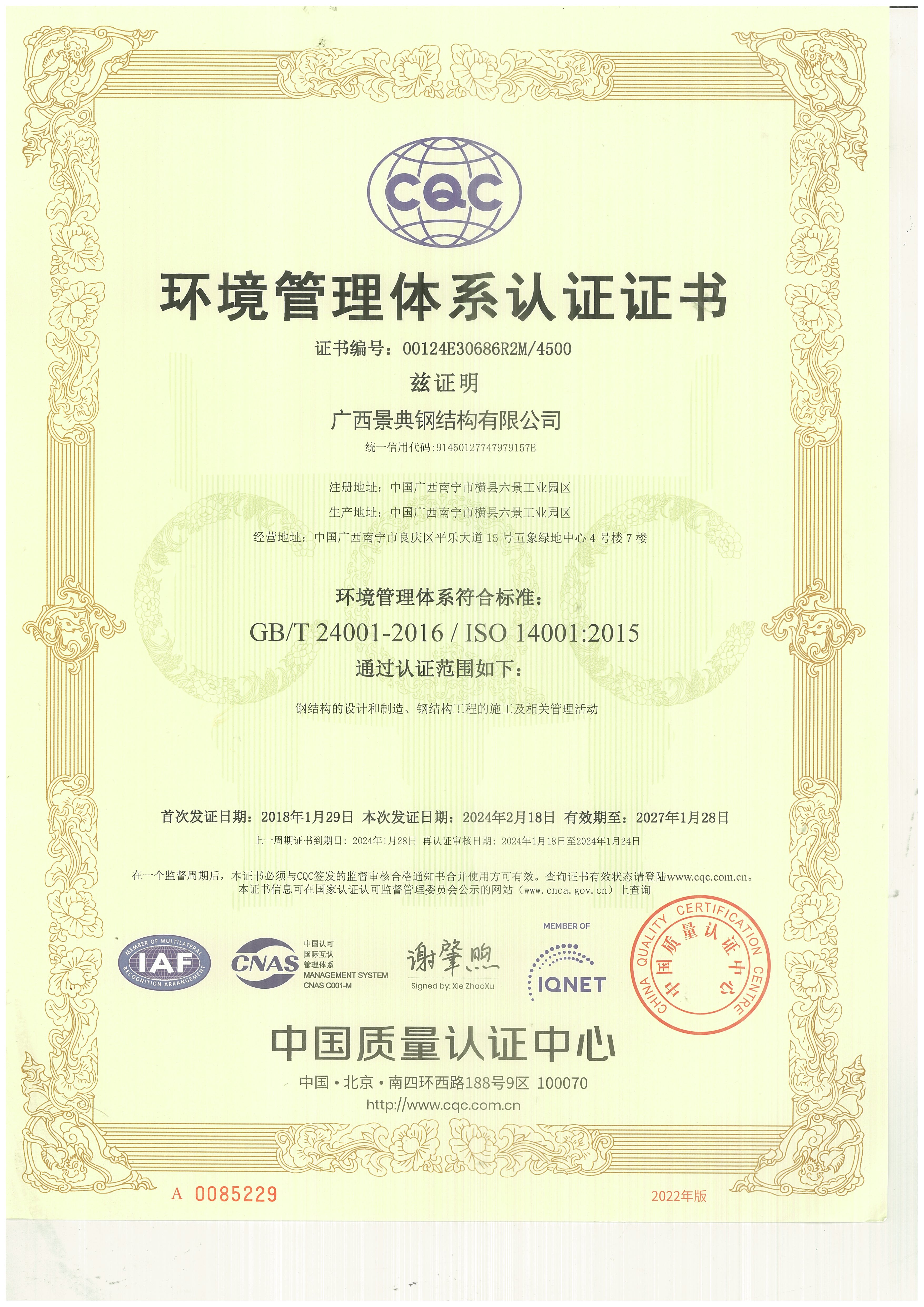 环境管理体系认证证书