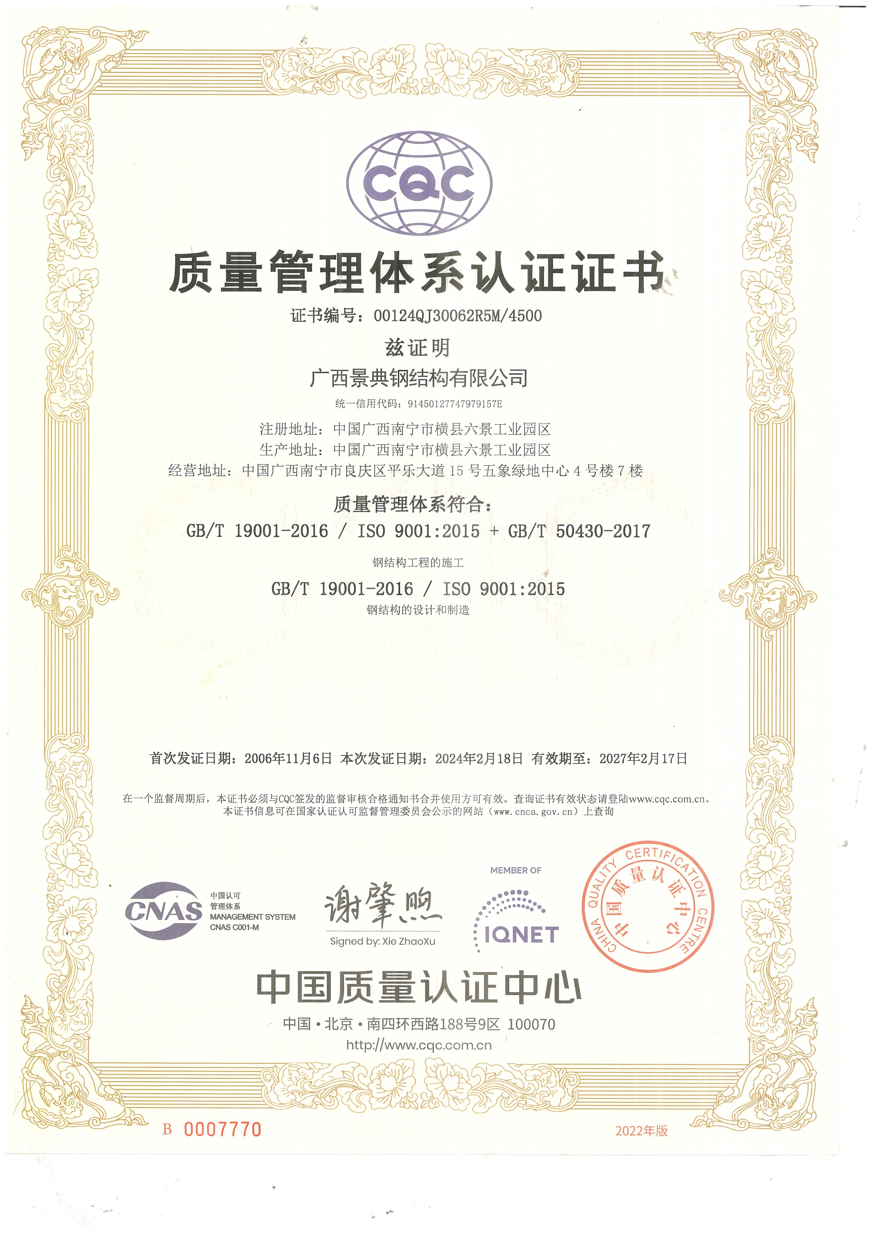 质量管理体系认证证书
