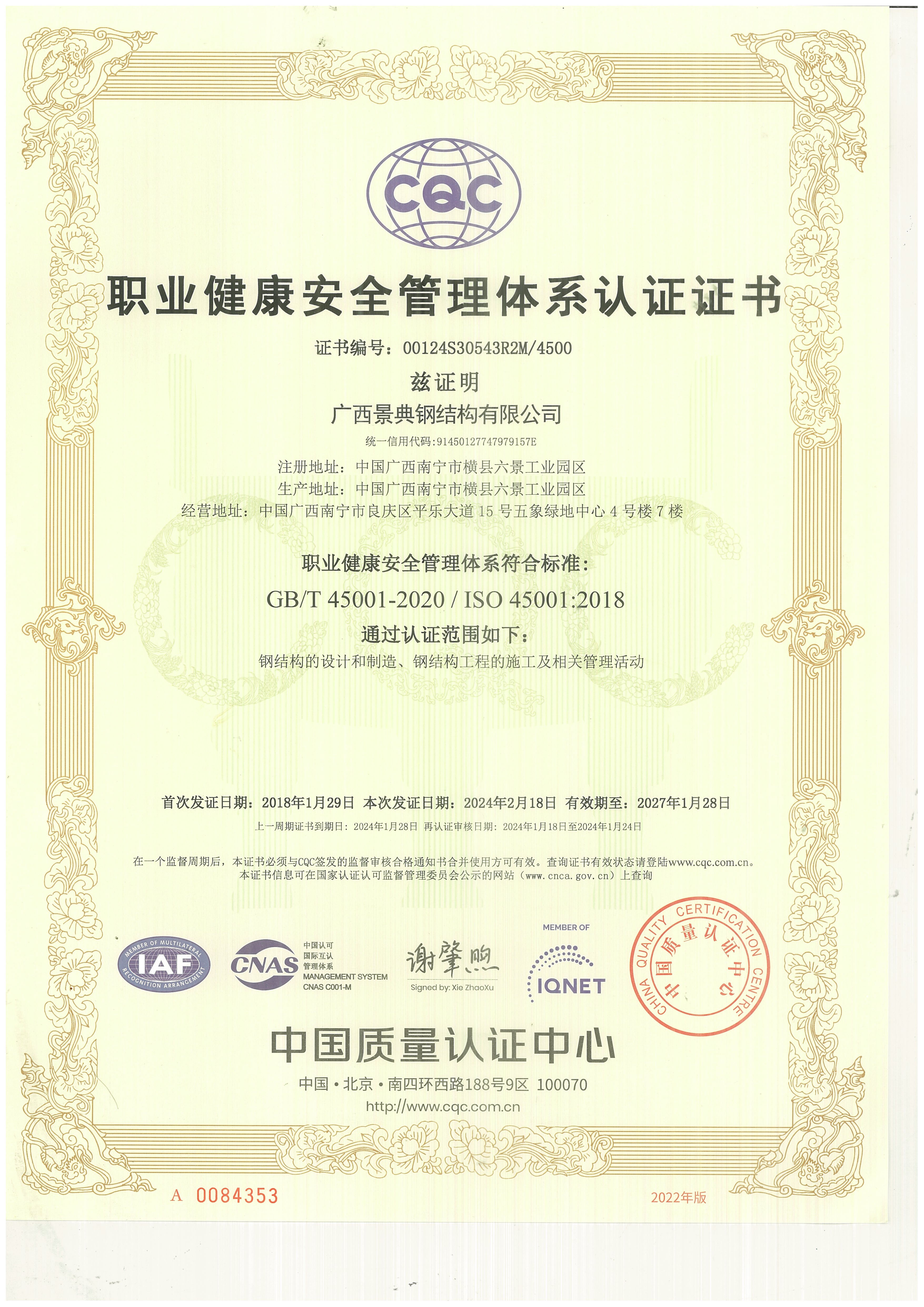 职业健康安全管理体系认证证书