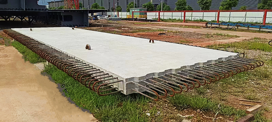 上横高速西津郁江特大桥为双塔组合梁斜拉桥,桥梁全长1190m,13#/14#主塔高为143m/138m,主桥长(51+89+400+89+51)m,两边跨为现浇预应力混凝土梁,两次边跨及主跨为钢混叠合梁。本标段共计276片混凝土预制桥面板,本项目的预制桥面板由景典装配式产业基地负责生产养护。