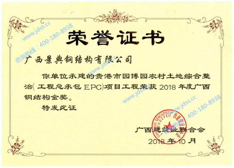 10月广西建筑业联合会授予“2018年度广西钢结构金奖”,获奖项目:贵港市园博园农村土地综合整治(工程总承包EPC)项目工程
