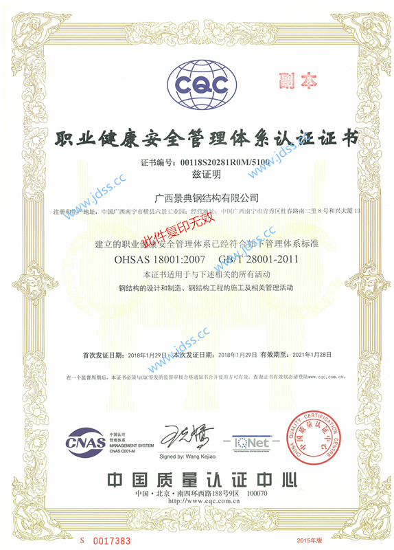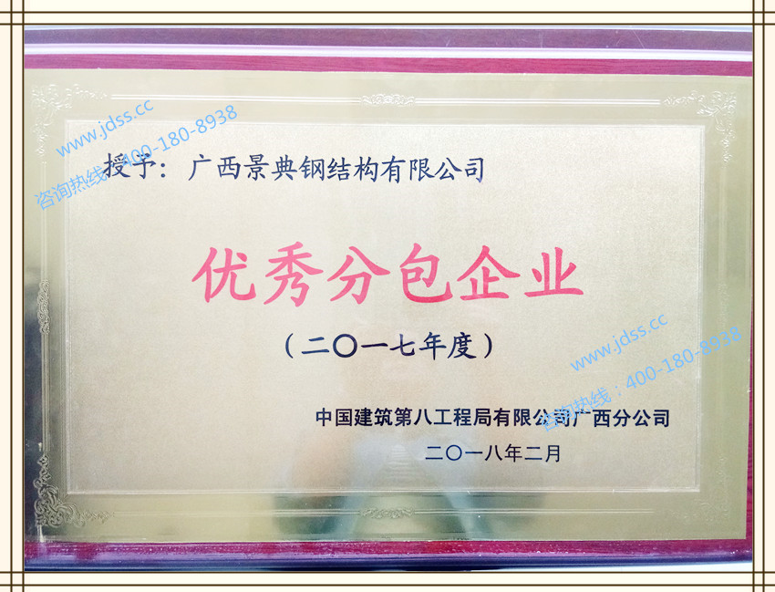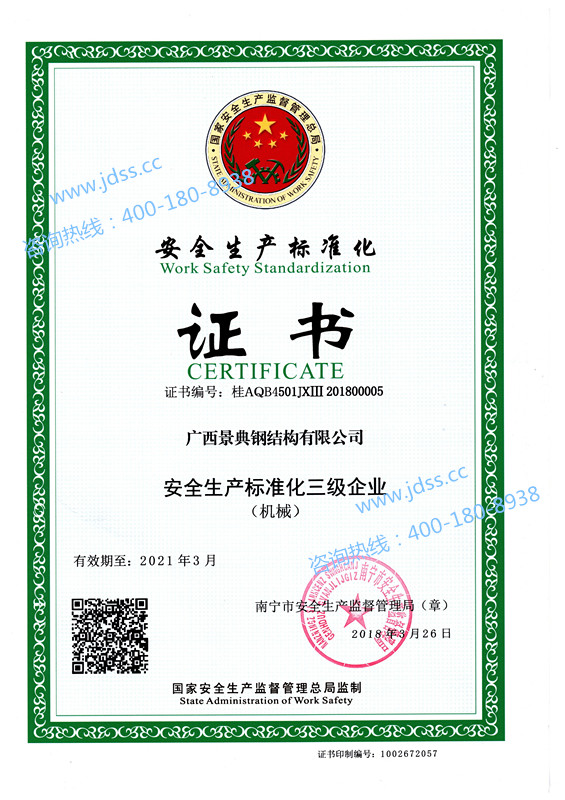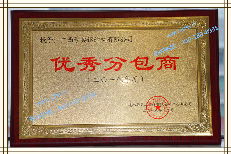 10月广西壮族自治区实施质量强桂战略工作领导小组授予广西景典钢结构有限公司的景典钢构建筑钢结构为“广西名牌产品”,产品品牌商标“景典钢构” ,有效期三年