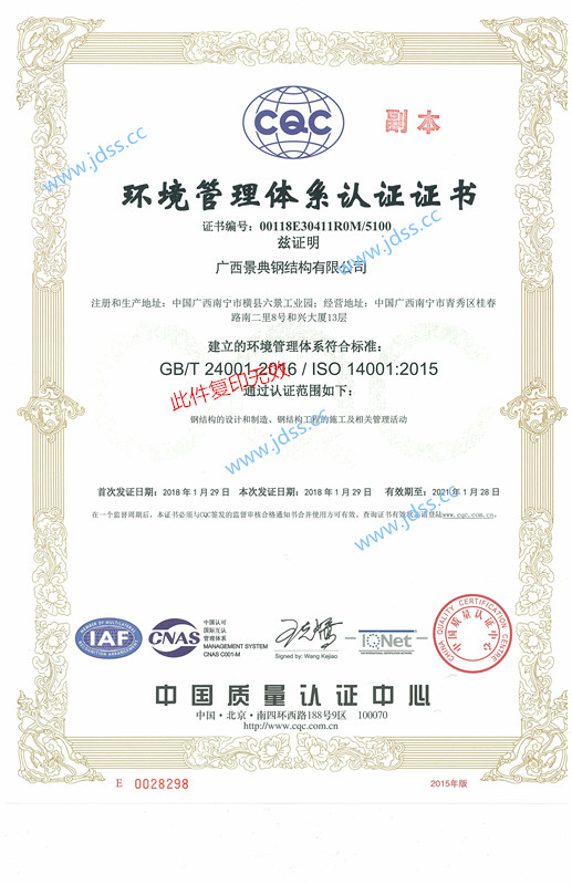 1月2018年新增“环境管理体系认证证书”、“职业健康安全管理体系认证证书”