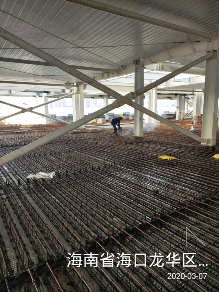 海口金盘科技项目加快实施维护结构、钢筋桁架楼承板以及防火涂料的施工。