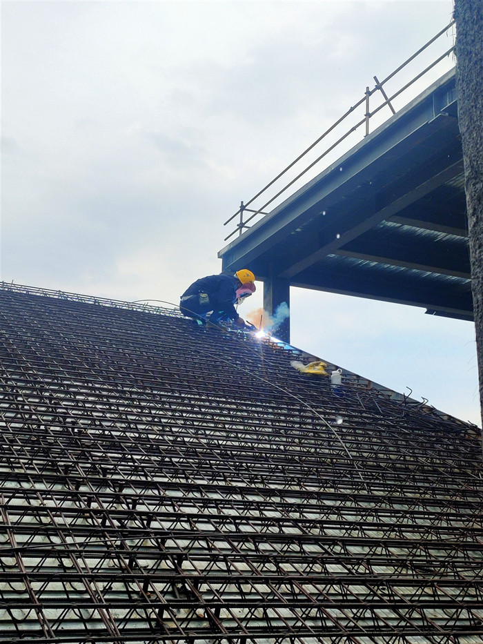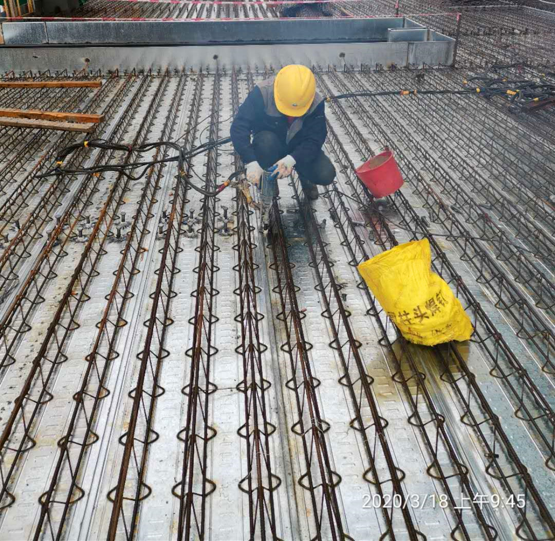 南宁民族饭店项目工人正在铺设钢筋桁架楼承板和构件焊接。