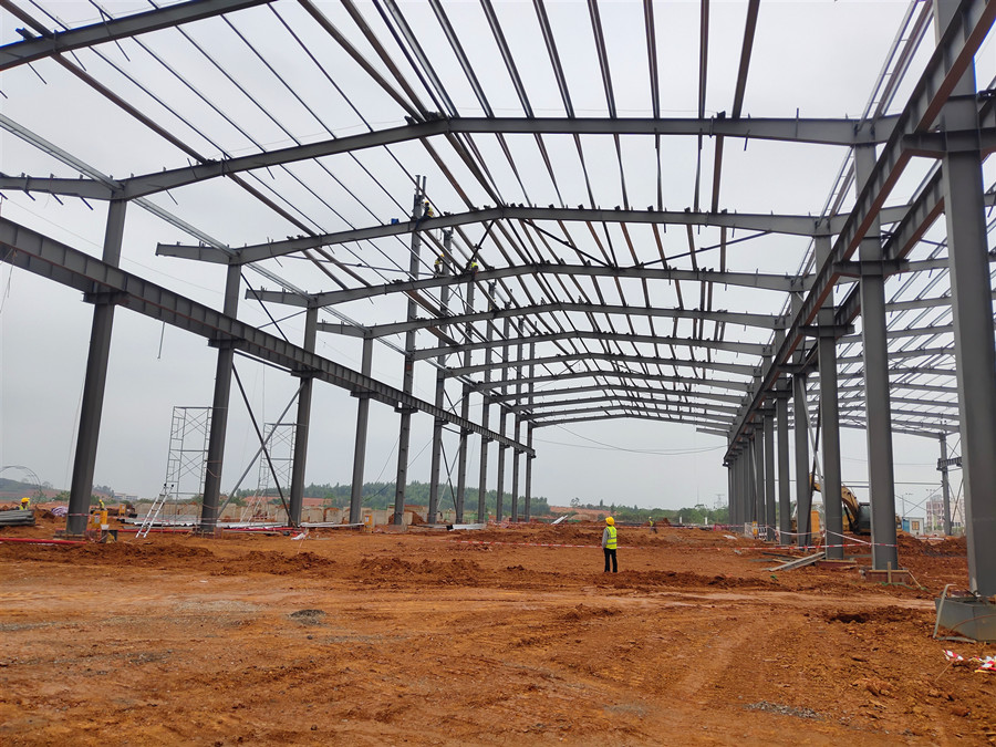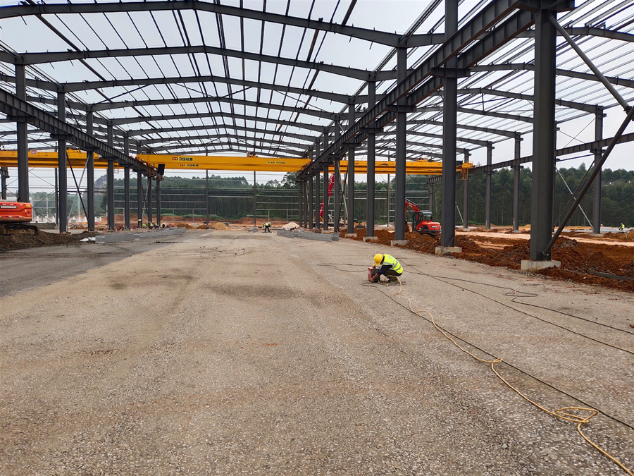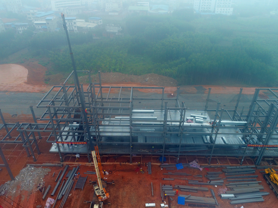 贵港钢铁集团钢渣资源化环保处理项目热闷主厂房钢结构工程工人正在进行最后的整顿收尾工作。