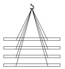 将捆绑结实的檩条采用现场吊机将檩条吊运至其安装部位。因为檩条单重小,且为线性杆件,绑扎容易,吊装时主要耗时的是起钩和落钩,为提高安装速度,采用一钩多吊的方法来提高工作效率,如图所示。