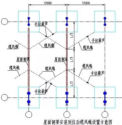 屋面钢梁吊装到位后,在松钩之前应连接相关屋面钢檩条等,使之形成一个空间框架的稳定结构。如果不能在松钩之前安装屋面钢檩条,为防止屋架钢梁歪扭,应拉设缆风绳。缆风绳在吊装之前固定到屋架钢梁上,共设四根,拉设位置在钢梁长度的1/3处,下面拉设在附近的钢柱柱脚。缆风绳选用Ф13.5mm,使用1T手拉葫芦拉紧。屋面主钢梁间连梁安装后,即可拆除缆风绳。