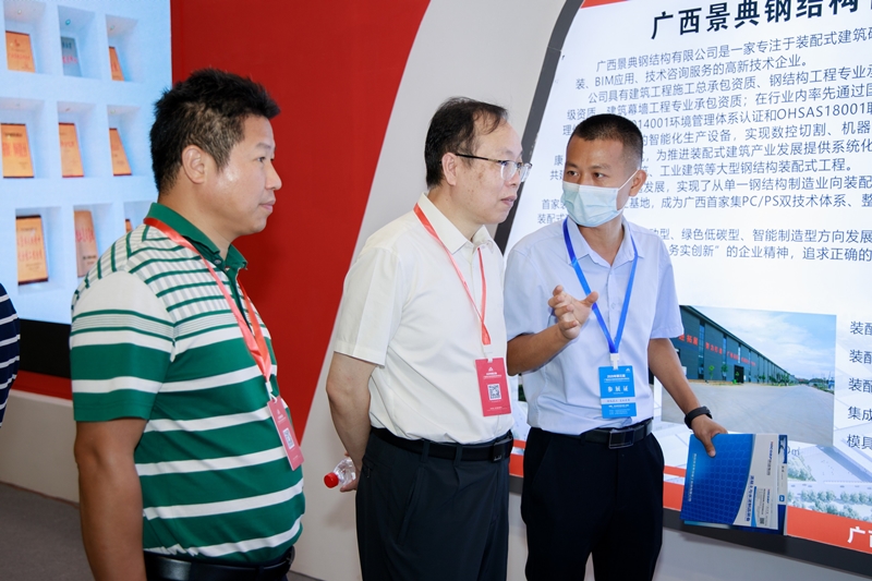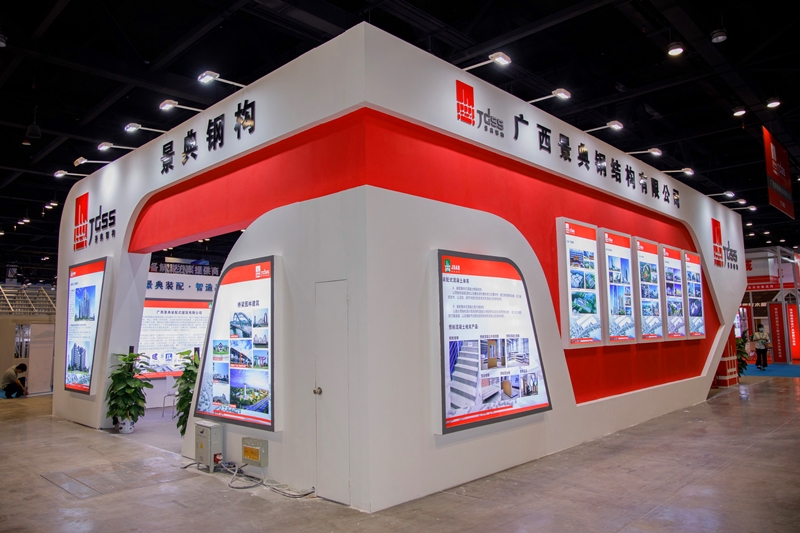 广西景典钢结构有限公司、广西景典装配式建筑股份有限公司在本次博览会上通过特装展厅的海报图片展览、视频演示、现场专业解说的方式重点展示了景典公司的装配式建筑生产基地和先进的智能化生产设备,以及“景典装配式建筑产业基地1号实验楼项目”的建设施工全过程视频分解,该项目从正式开工建设,正负零至结构封顶总共用时13天,是装配率高达92%的三星级绿色建筑,主体结构为钢框架体系,其中采用的无支撑钢筋桁架楼承板,使现场钢筋绑扎工作量可减少50%-60%,大大减少或无需施工模板和临时支撑,进一步缩短了施工工期;部品部件的应用包含:预制叠合楼板、装配式混凝土预制楼梯、新型石材发泡轻质内墙板,项目所用预制混凝土、预制钢构件、整体卫浴等均由广西景典钢结构有限公司、广西景典装配建筑股份有限公司自主生产,由广西建筑科学研究院研发参建,是广西首家自产自营自建的装配式建筑示范项目。
