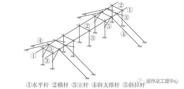 (4)在斜拉杆与水平杆节点处向两侧架设斜支撑(支撑打入地基土深度约30cm) ,然后在支撑附近安装横向拉杆,并在基础上部由水平杆和横向拉杆组成井字架,形成一空间几何不变体,确保架体的刚度和稳定。