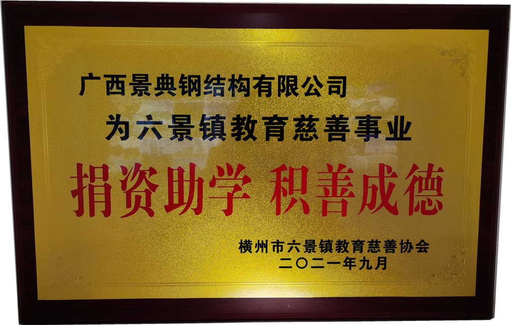 广西景典钢结构有限公司自成立以来,努力发展壮大的同时,积极参与横县、六景镇等周边贫困户、贫困学生的慰问活动、捐资助学活动,热情地为教育事业奉献一份绵薄之力,衷心的希望六景镇的教育事业、经济事业发展越来越好,培养和帮扶出更多的优秀人才、优秀企业。