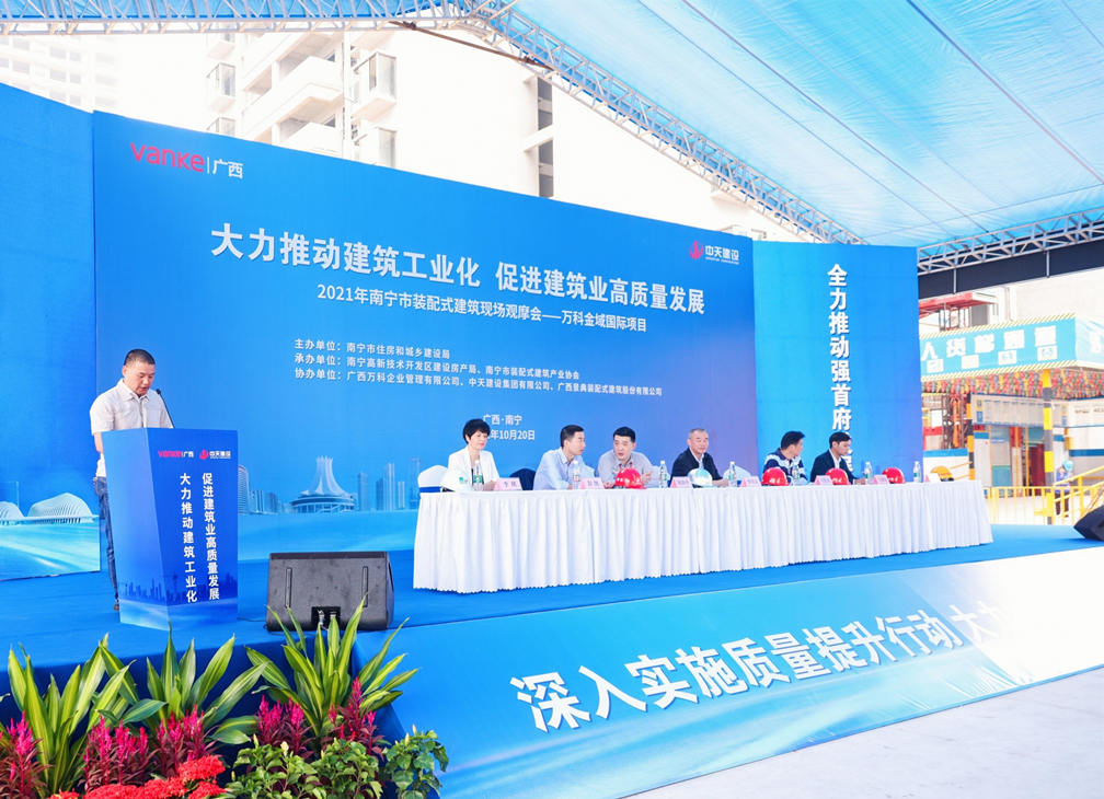 2021年10月20日,“南宁市装配式建筑现场观摩会暨万科金域国际工地开放”活动在万科·金域国际隆重举办。南宁市住建局专家领导曾桂荣、广西万科企业管理有限公司企业代表陈致中、中天建设集团企业代表赵琅珀、广西景典装配式建筑有限公司副总经理李琪、金域国际业主代表等受邀莅临现场,近距离参观装配式建筑在金域国际项目上的技术应用,体验金域国际的精工品质与匠心工艺。