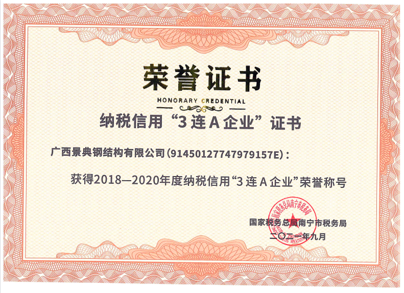 经税局纳税信用等级评定委员会审核,评定广西景典钢结构有限公司纳税信用等级为AAA级并授予牌匾和证书,以资鼓励。