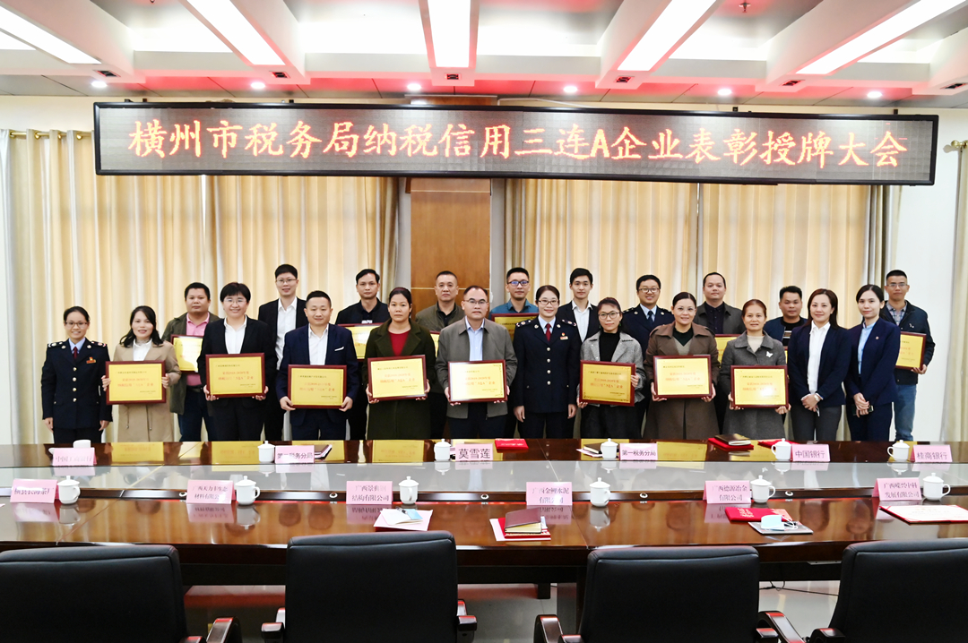 11月9日,为进一步推进税收诚信体系建设,提高纳税人的纳税遵从度和荣誉感,进一步营造诚信纳税的良好氛围,国家税务总局横州市税务局纳税信用三连A企业表彰授牌大会顺利举行。