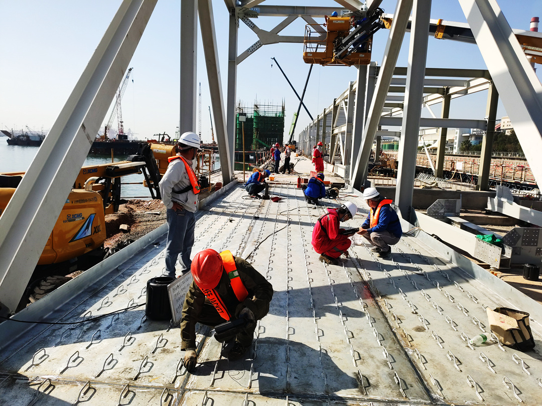 人行桥桥面板焊缝的跨度长,加之母材是镀锌材质,焊接难度相比较常规的钢构件要大很多;桥底连接板焊缝的焊接是仰角焊,施工空间非常狭窄,焊接人员要侧卧在作业区施焊,焊渣和火花直接落下,施焊的工人即便做好层层防护,这样的作业环境也难免不了吃苦受累。