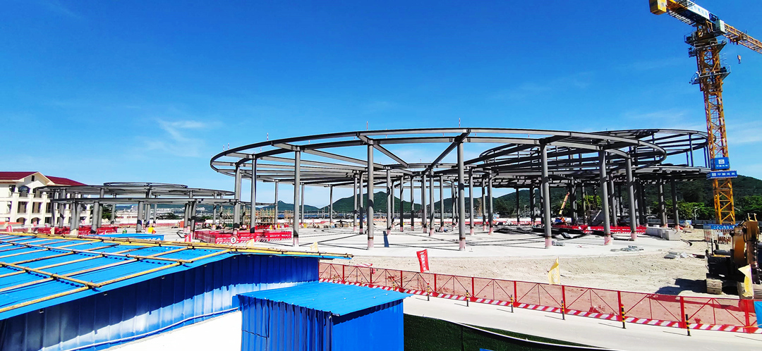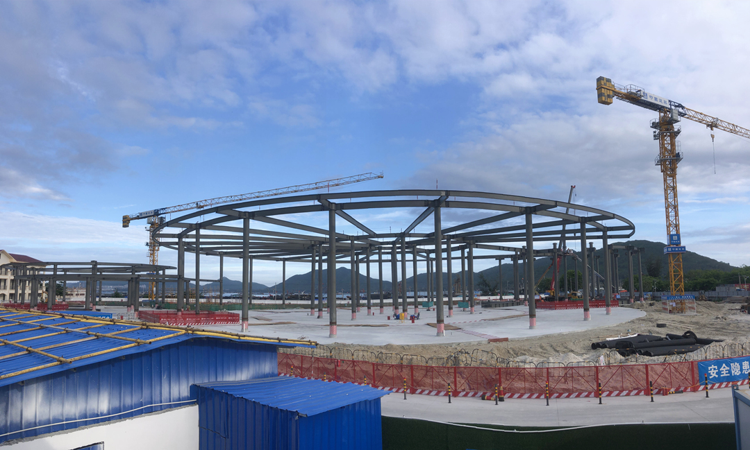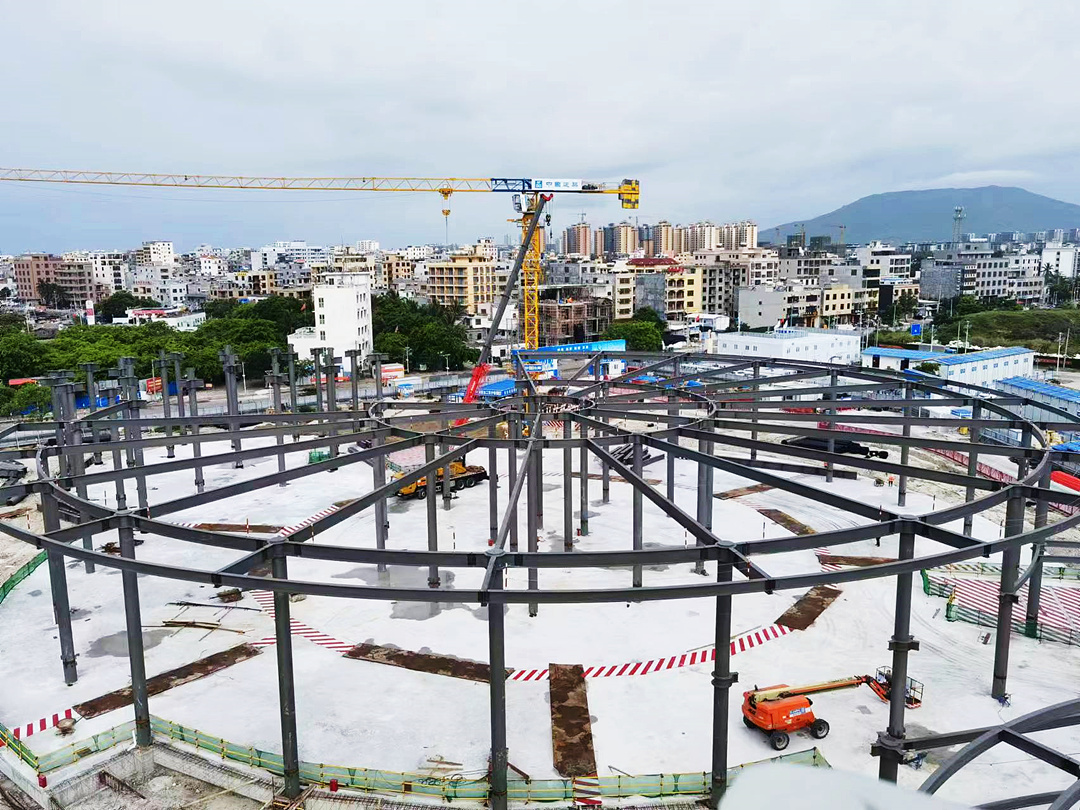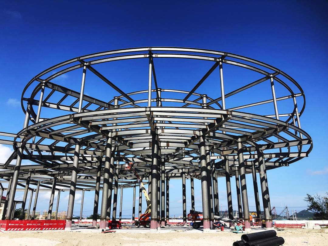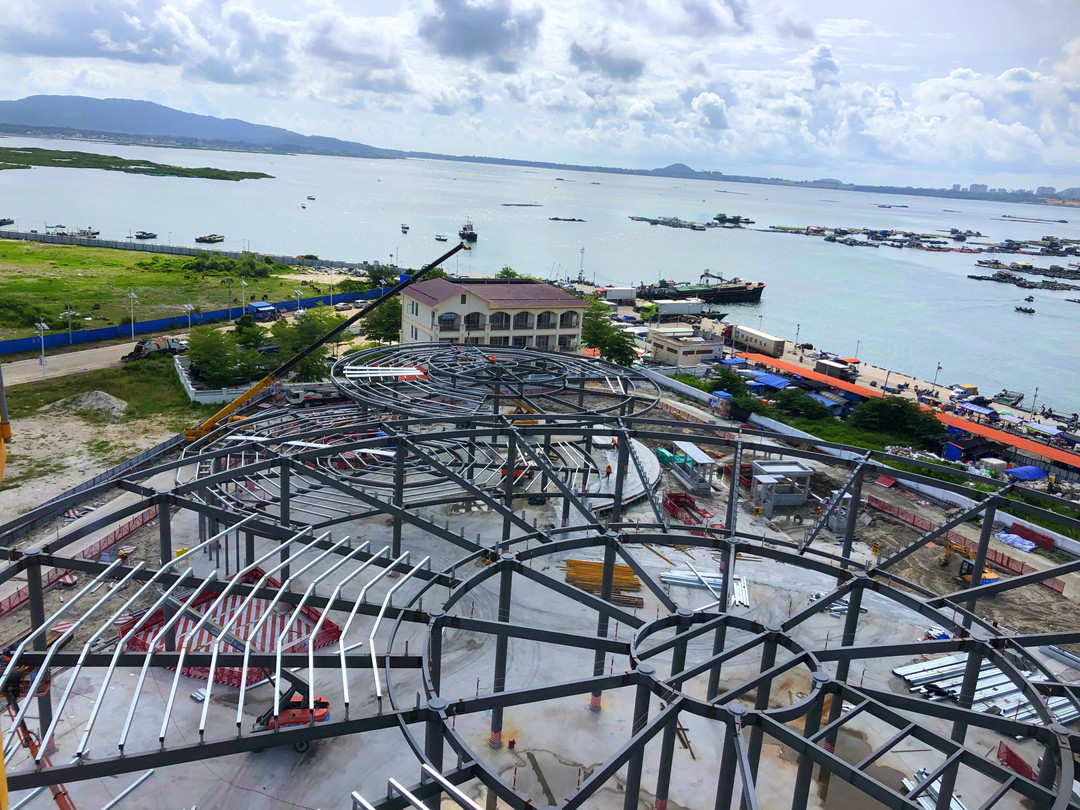 目前,海南疍家博物馆项目正进行钢结构施工。项目整体进度已基本完成,主体钢桁架、楼层板还有檩条已基本按工期计划完成。 “因为结构形似“疍家帽”,属异型结构,所以钢结构施工测量精度要求较高,测量、校准工作是这个项目钢结构安装质量控制最重要的工作之一,每天对待测量工作就像对待考试一样,反复复核测量数据,严格控制高程的传递精度,以确保各楼层高度和总体设计高度。”项目经理梁建德说。