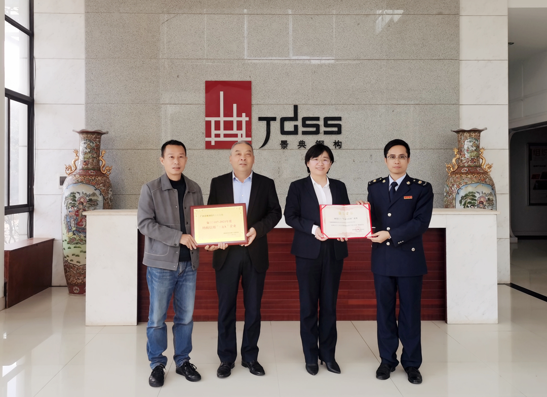 为进一步优化营商环境,推进企业诚信纳税、守法经营的良好氛围,1月13日,国家税务总局横州市税务局党委委员、副局长谢武,第二税务分局副局长陈怀远一行为广西景典钢结构有限公司送来了纳税信用“5连A”企业的荣誉奖牌。