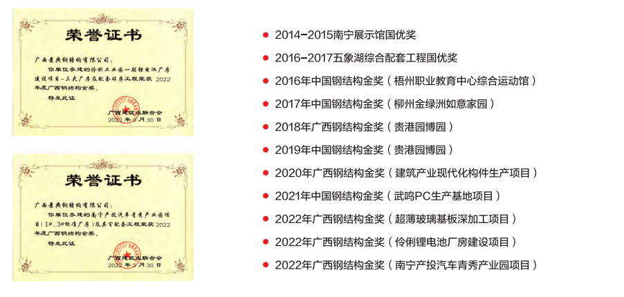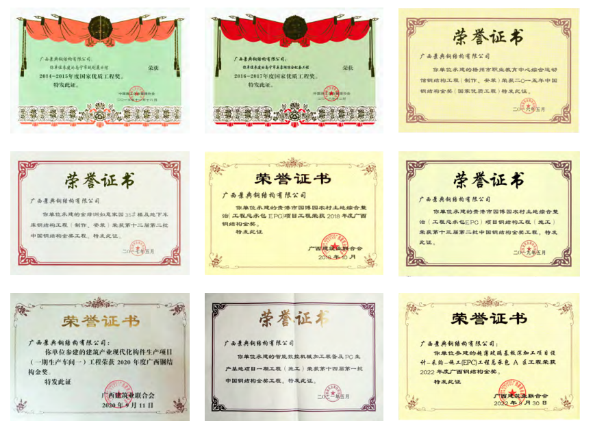 公司凭借专业的钢结构技术团队,加快创新管理和生产智能化转型升级,致力于绿色建筑工业化装配式钢结构制造方面的关键技术研发与应用,先后获得建筑钢结构行业竞争力榜单前百名企业、钢结构行业诚信企业、中国钢结构金奖、国家优质工程奖、广西名牌产品、国家装配式建筑产业基地、广西技术研发中心、瞪羚企业、首个广西装配式建筑示范工程、低能耗建筑示范区等荣誉。