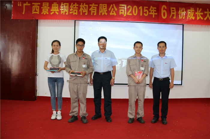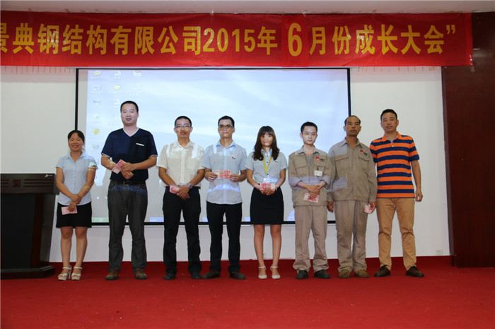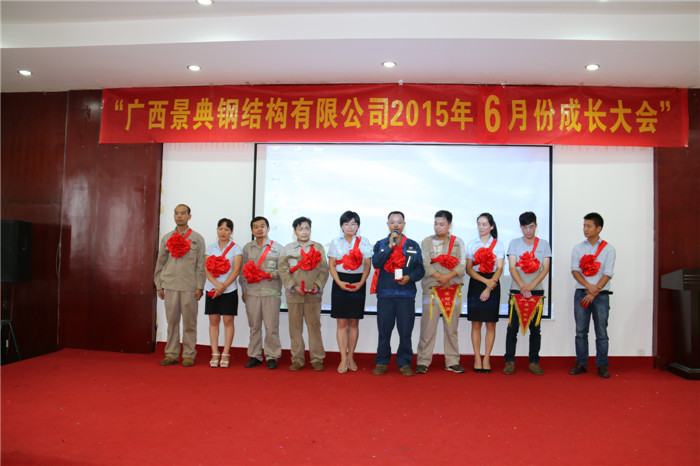 随后,是每月必不可少的优秀表彰环节。获得5月份优秀单项奖的有:最佳活跃奖:黄加琴、陈飞、梁佳琳,最佳勤奋奖:秦前檩、张忠锁,最佳回款奖:司银英,最佳拜访客户奖:苏国慧,最高产量奖:李长安,最高质量奖:卢太进,最佳卫生奖:维护车间、轻钢一线焊接班,最佳微笑奖:吴敏凤,最佳学习奖:卢德林。获得5月份质量安全奖的有:①武鸣富鸣项目,施工用电规范标准,奖励靳文化施工队500元;②昆明鼎杰项目,吊装安全防护、焊缝质量、施工图日志方面表扬,奖励陈连朋施工队500元、奖励昆明鼎杰项目部200元;③贵州轮胎项目,管理资料方面表扬,奖励该项目部300元;④桂南电缆厂项目,维护外墙、包边平直方面表扬,奖励景其勇施工队500元。