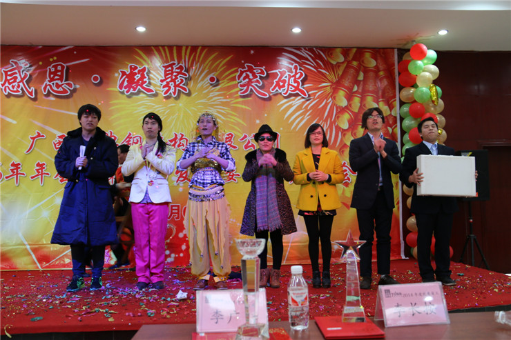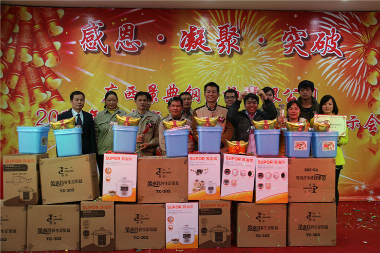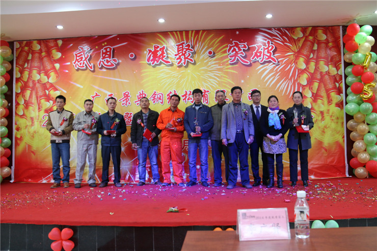 会上,夏志林总经理对2014年发改委的工作做了简要的总结,并对2015年年会致辞。接着进行了公司2014年度优秀团队、销售冠军、优秀项目、优秀员工的表彰颁奖,获得2014年年度优秀团队的有:设计部、工厂小件班;获得年度优秀项目的有:百色丰林项目、南宁动车所项目;获得年度优秀员工的有:俞则封、殷公响、李刚红、李长按、李广贤、李新超、管玉朝、王冬训;获得销售冠军的有:苏国惠。根据公司的奖励制度,对以上获奖的优秀团体、个人给予了丰厚的现金奖励,对优秀员工的父母给予了2000元养育金的奖励;成长路上,少不了父母、、朋友、团队的默默支持,景典公司感谢员工们辛勤付出的同时,更要对优秀员工的父母致予最崇高的感恩和感谢。