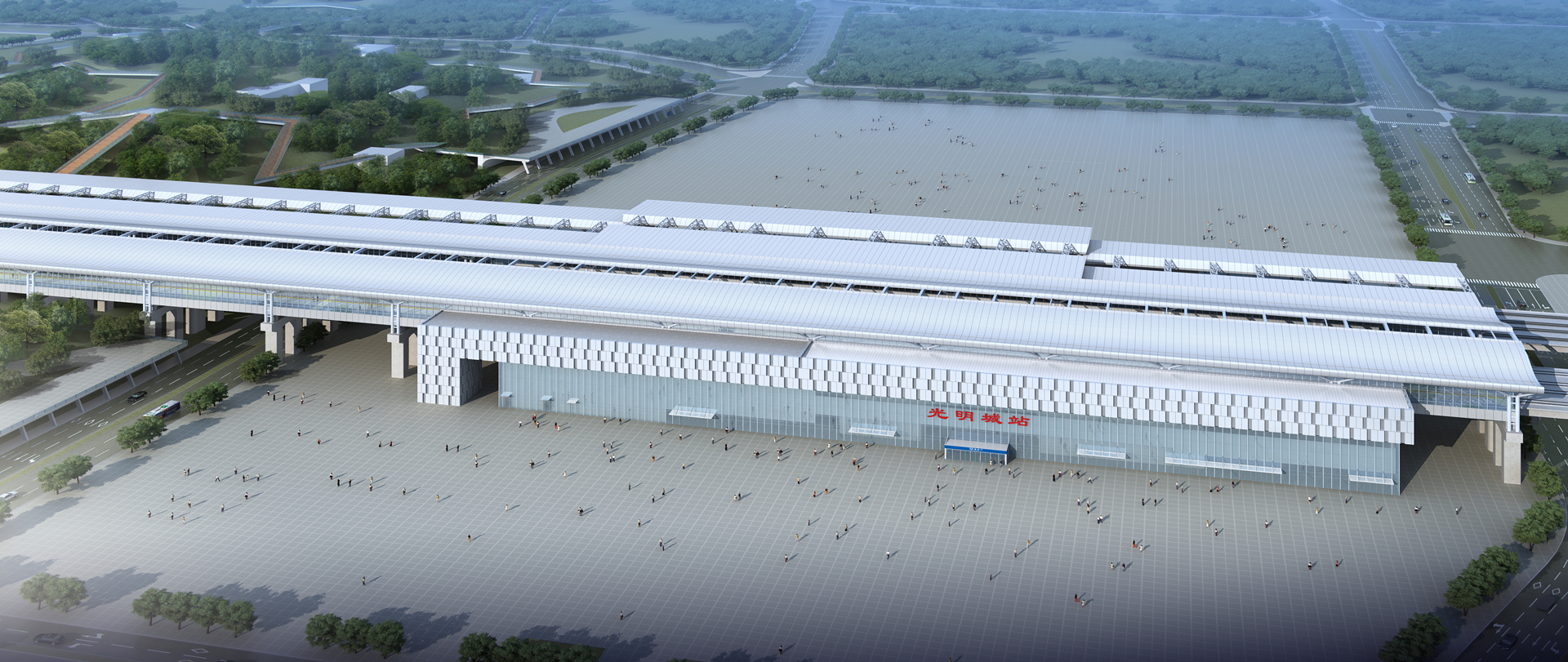 新建赣深铁路塘厦至深圳北段光明城站站房钢结构工程量为3300吨,由景典钢结构公司负责建设。站场规模为 2 台 4 线,位于既有广深港站场的东侧,站台宽 8m,长 450m,站场采用高架轨道桥架空。